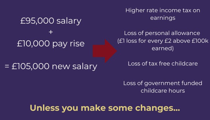 Most of us welcome a pay rise, but just a £10,000 pay rise could trigger a cascade of losses. On paper, you’re better off, but in reality, crossing the £100,000 threshold results in: